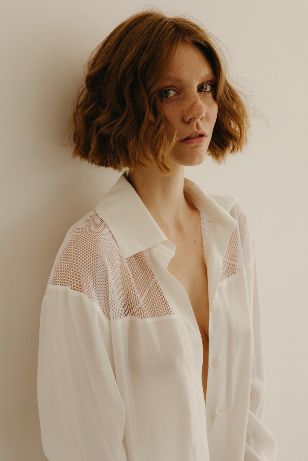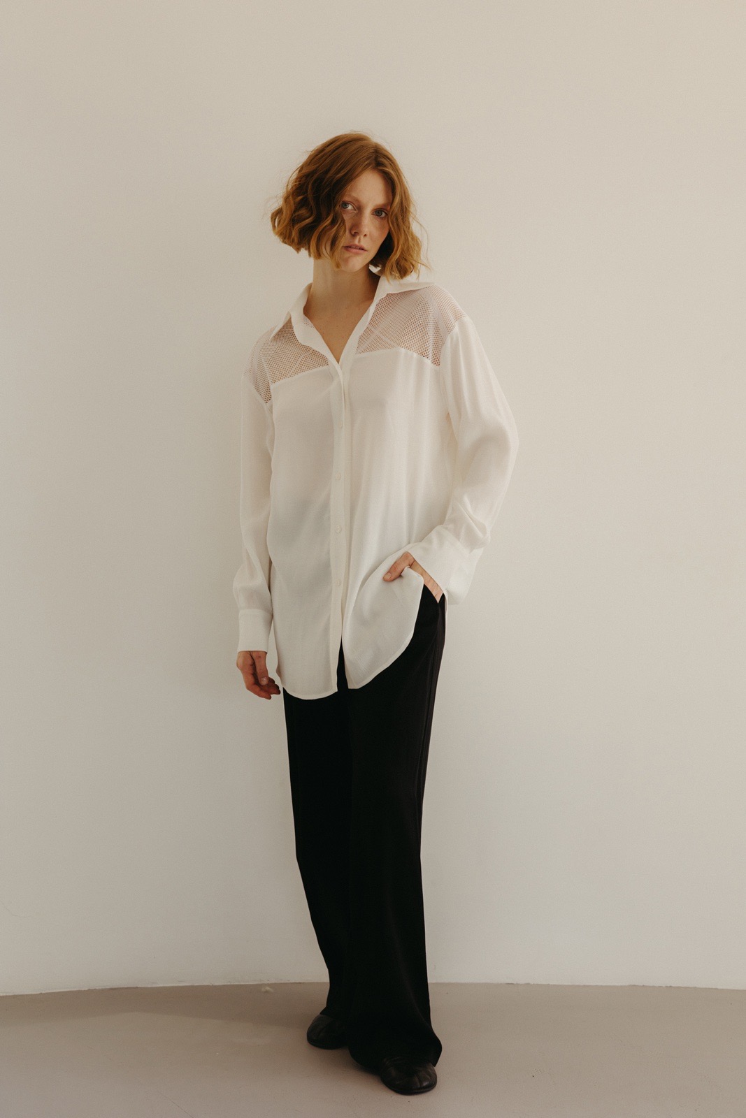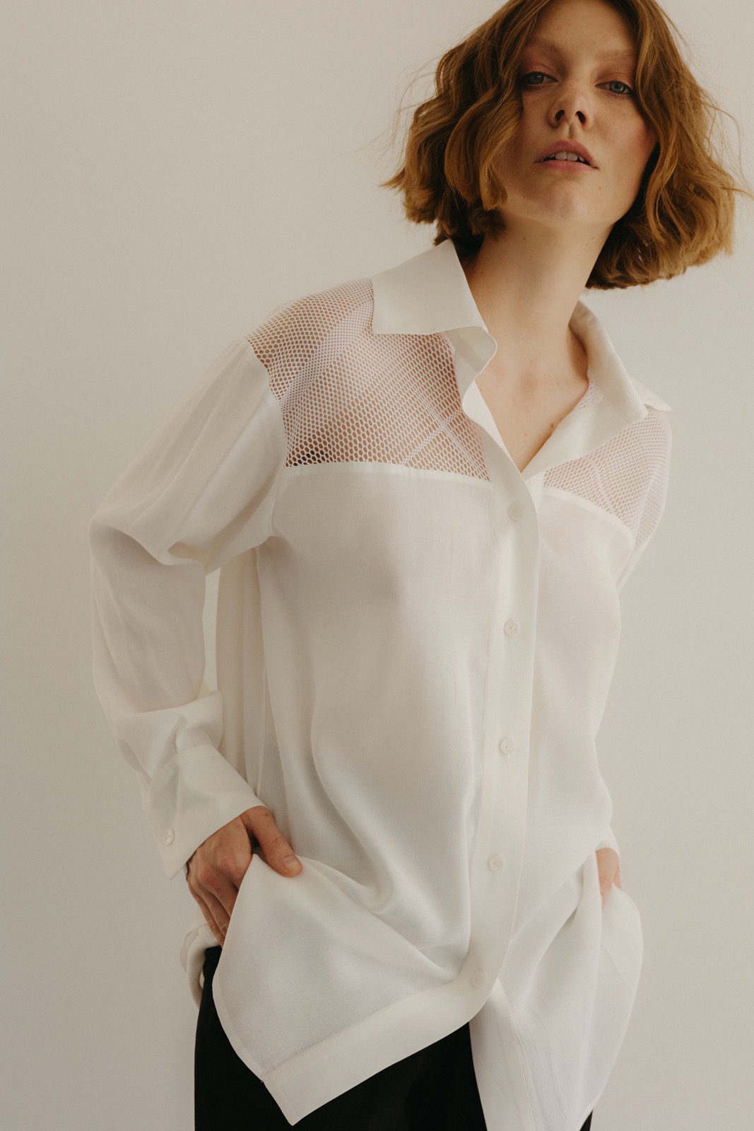 Сорочка вільного крою з віскозної крепової тканини - oversize. Модель подовжена. Класичний комір. Довгий рукав. Кокетка з сітки. Сорочка фіксується ґудзиками