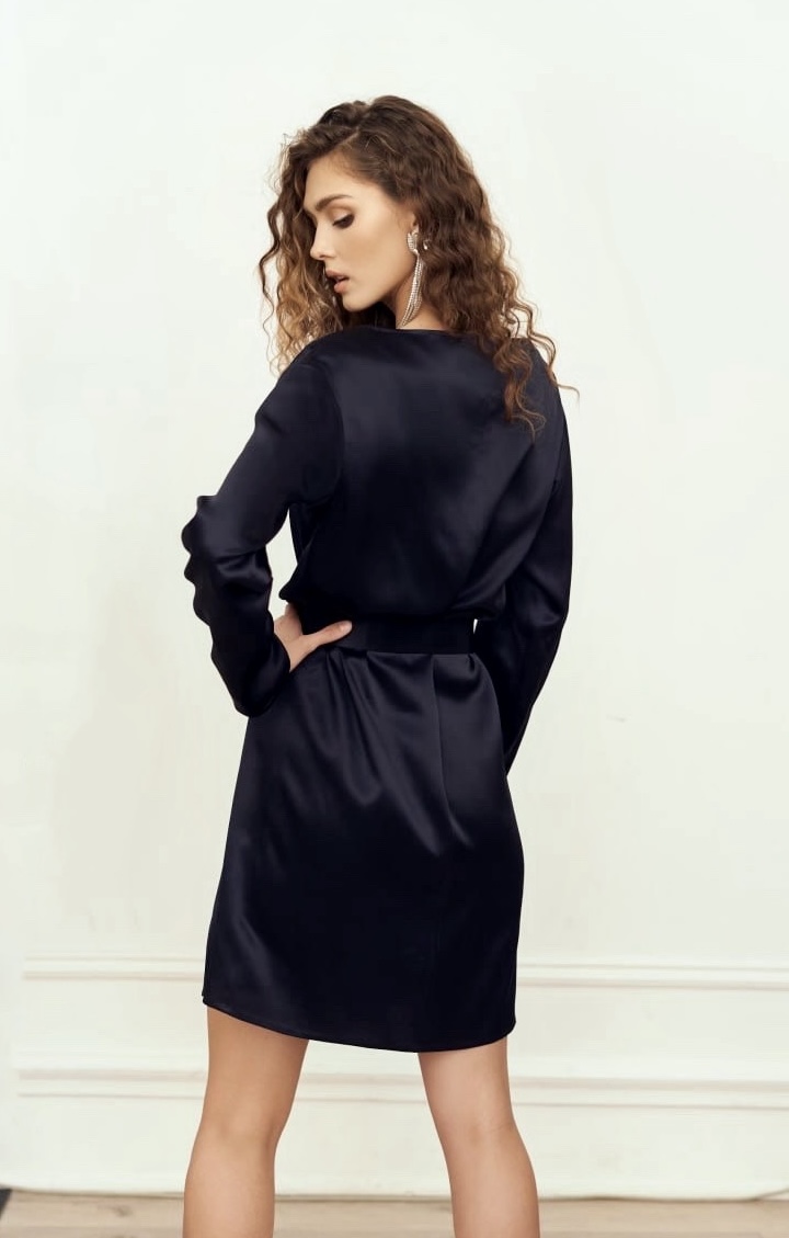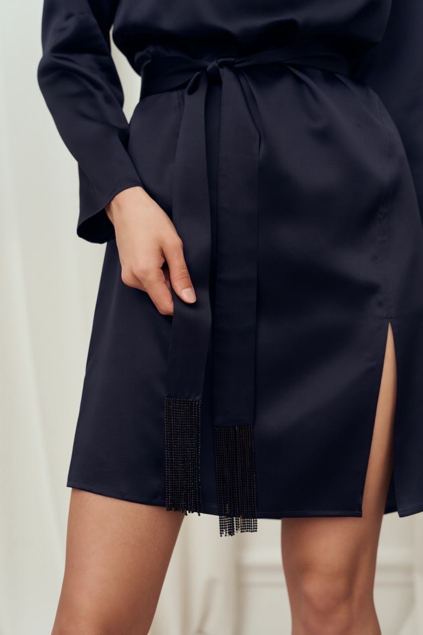Сукня довжини міні виготовлена з шовку. Модель з довгими рукавами та доповнена розрізом спереду, який підкреслює лінію ноги. Сукня фіксується паском