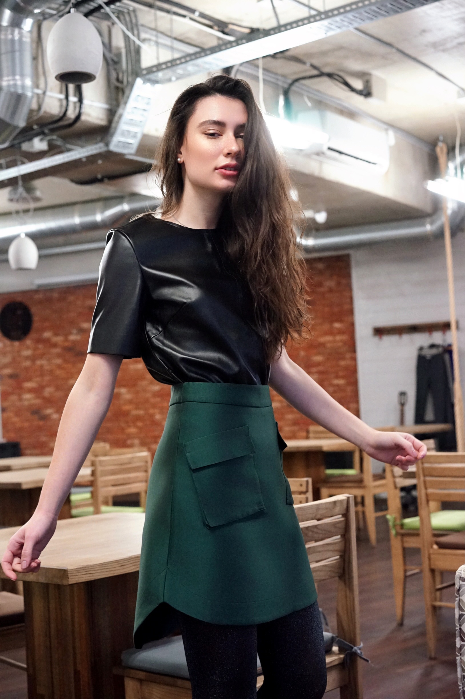 Спідниці яскраво вираженого А-подібного силуєту. Матеріал спідниці добре трримає форму. Дві накладні кишені-партнері з клапанами. Спідниця має закруглений низ спереду та по спинці. Спинка - подовжена. Спідниця фіксується металевою блискавкою.