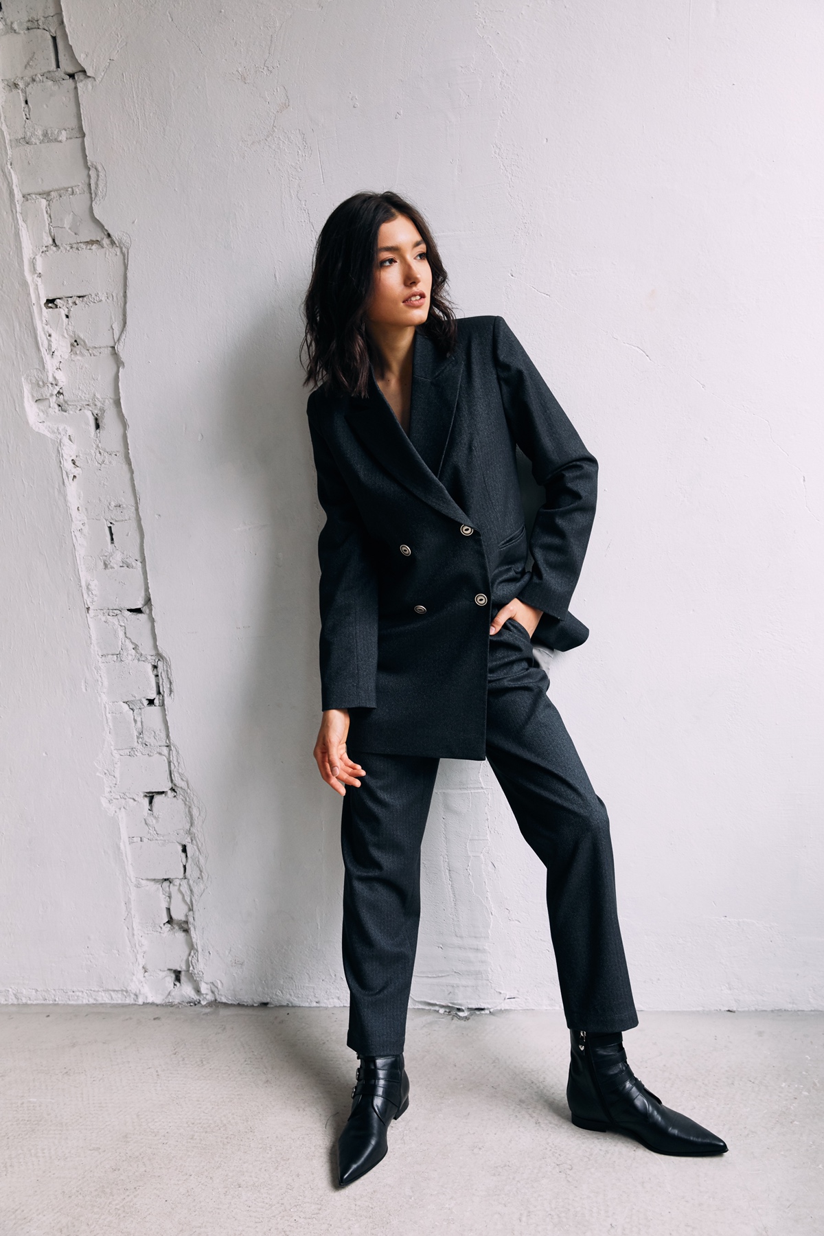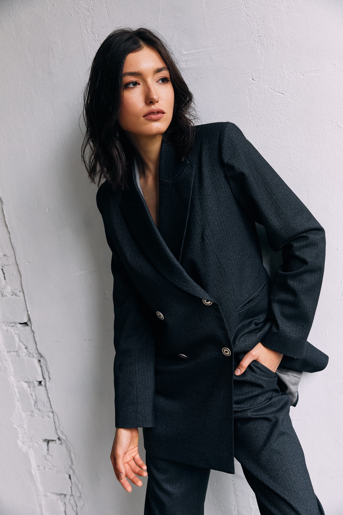 Подовжений двобортний жакет з лацканами. Принт "ялинка". Жакет подовжений. Довгий рукав з ґудзиками. Підкреслена лінія плечей. Дві кишені з клапанами спереду. Фіксується на ґудзики. Модель на підкладці